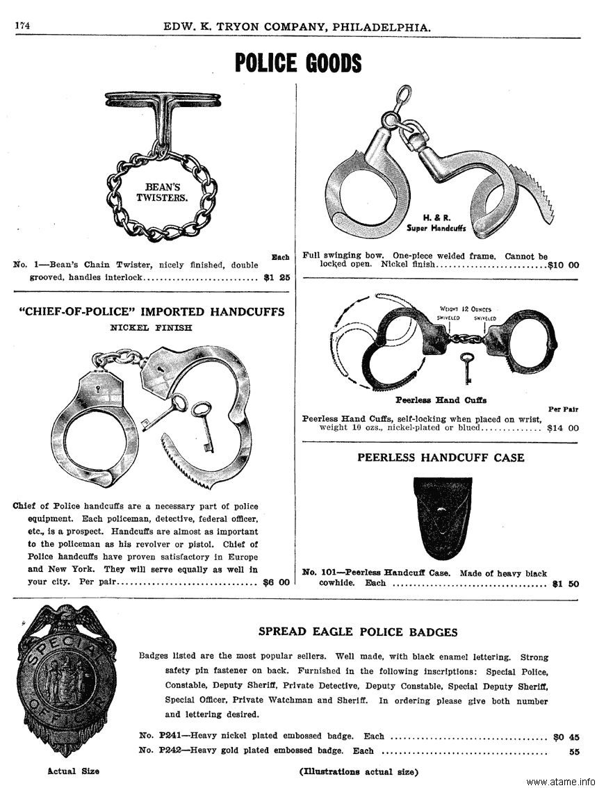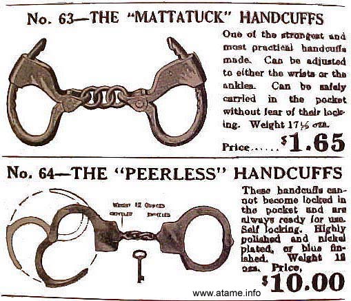 sieht und zum anderen das erste Modell der Peerless Handschellen mit Durchschlag
